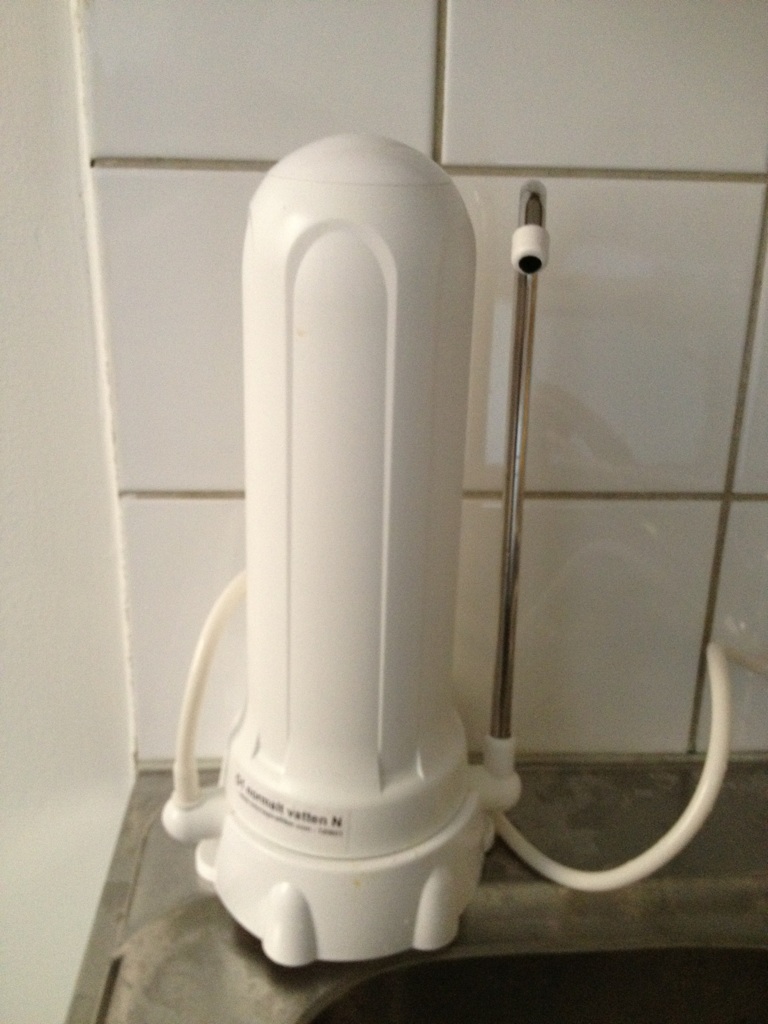 En vattenrenare. Nu känner jag nästan att jag borde bli återförsäljare. När vi nu dricker vatten härhemma så är vattnet renat. Det finns en kran för det renade vattnet och när det är dags att diska så stängs den kranen av så vi kan diska i orenat vatten.