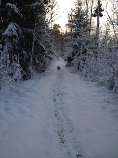 Igår tog vi bussen till landet. Det var helt underbart att vakna upp härute. Det är alldeles vitt. Vi har precis gått en långpromenad och jag låtsades att jag gick stavgång, för att få lite blodgenomströmning i armen.