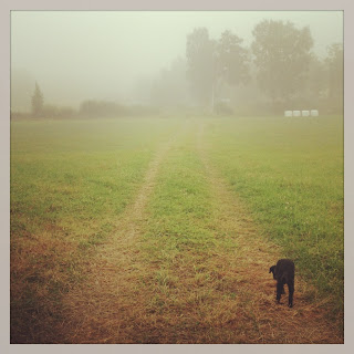 Nu har jag också en gata, eller snarare väg och sen kommer den här fina gräsvägen där man sneddar över åkern, för att komma fram där bakom de vita balarna till Lyckhem pensionat och till Yogavita. Just i morse var det dimma. Det påminner om Båstads fina luft. Vi har haft två riktigt regniga dagar härute, men det lovas sol redan i morgon. Men det är nåt med dimma. Den där fuktiga luften som gör håret extra lockigt och liksom fuktar huden.